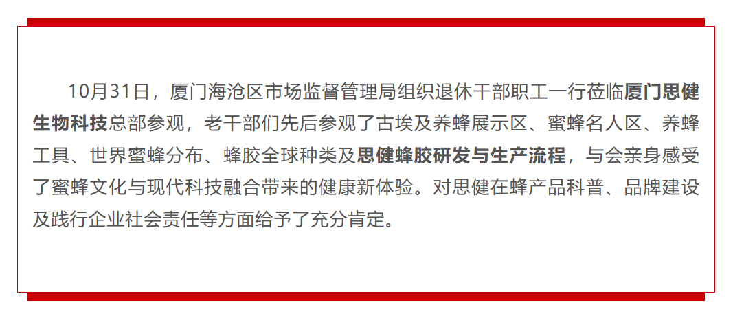 思健科技動態(tài) | 海滄市場監(jiān)督管理局退休干部職工參觀思健蜂主題科技館及蜂膠生產車間