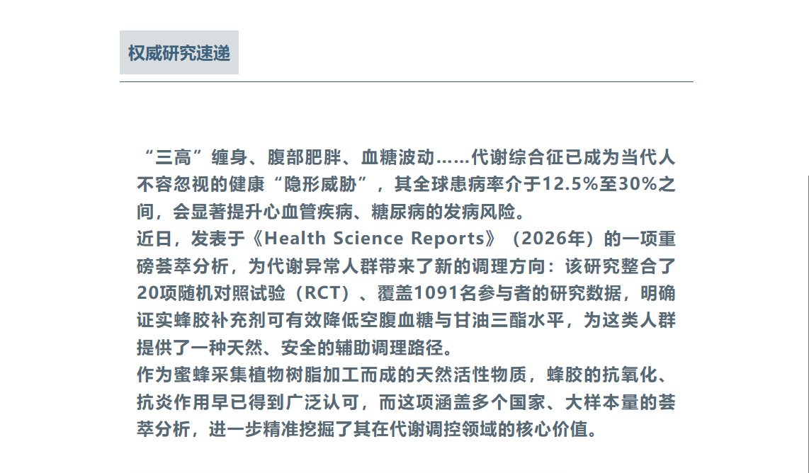 蜂膠科研再出新成果!20 項臨床試驗證實調(diào)控血糖血脂精準(zhǔn),代謝綜合征人群新福音